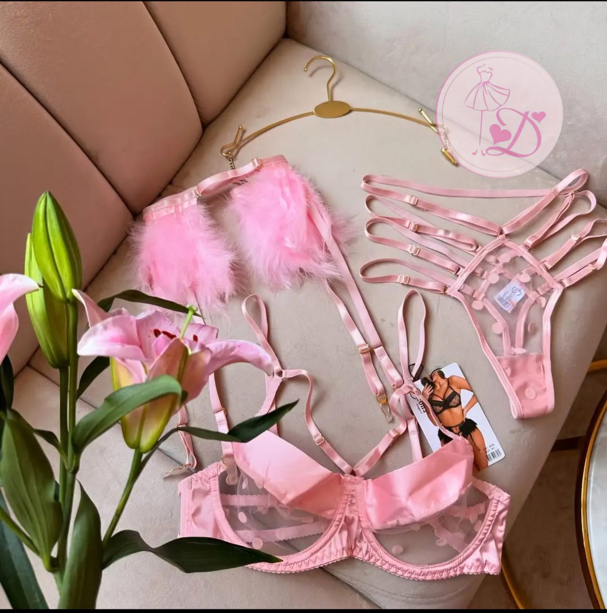 Osez l’originalité avec cet ensemble marron au design sophistiqué. Associant tulle transparent à pois et détails en fourrure, il offre un style unique et élégant. Soutien-gorge structuré, string assorti et ceinture sensuelle, tout est réuni pour sublimer votre silhouette.