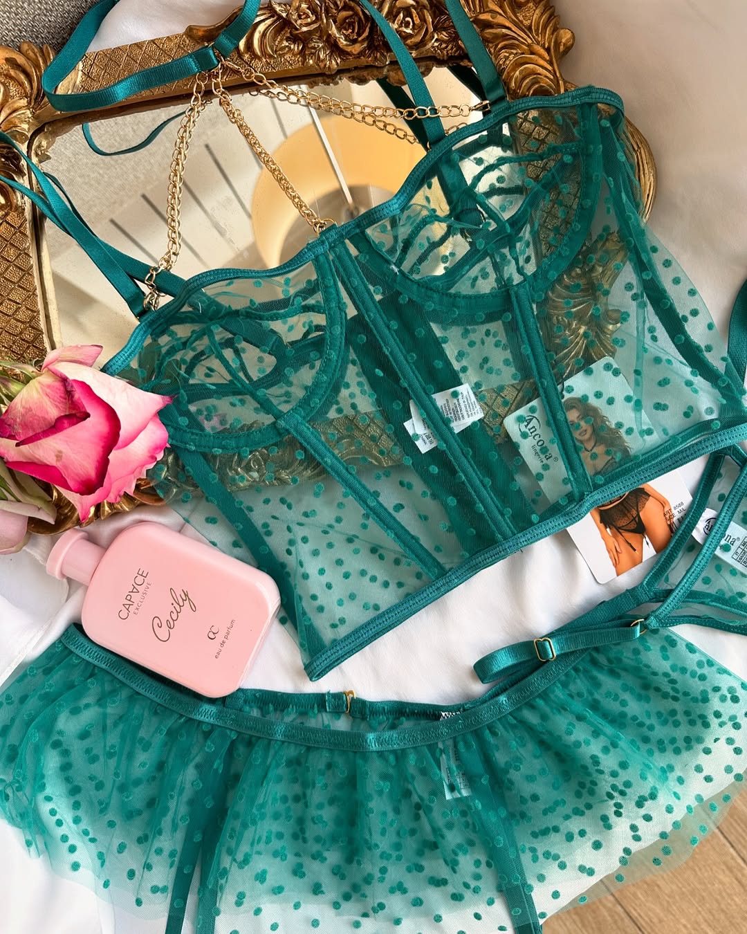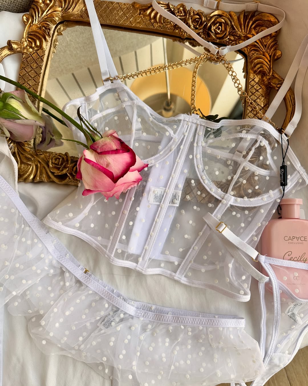 Un ensemble raffiné composé d’un soutien-gorge, d’un string et d’un porte-jarretelles en tulle léger et délicat, pour une silhouette mise en valeur tout en élégance.