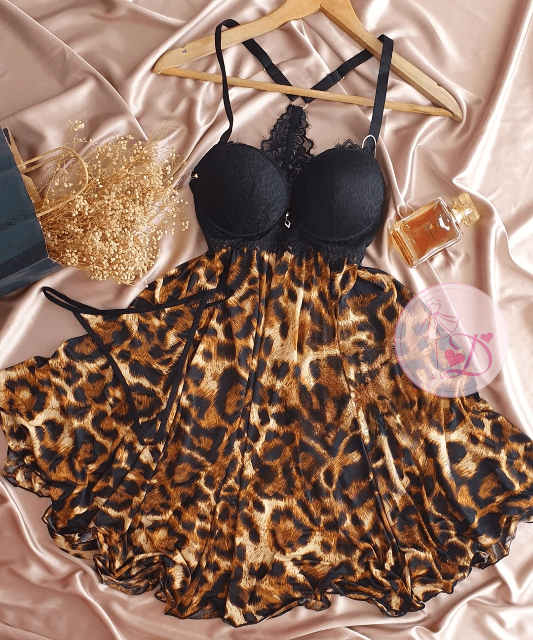 đ Nuisette lĂ©opard & haut noir â Dentelle raffinĂ©e & dĂ©tails brillants