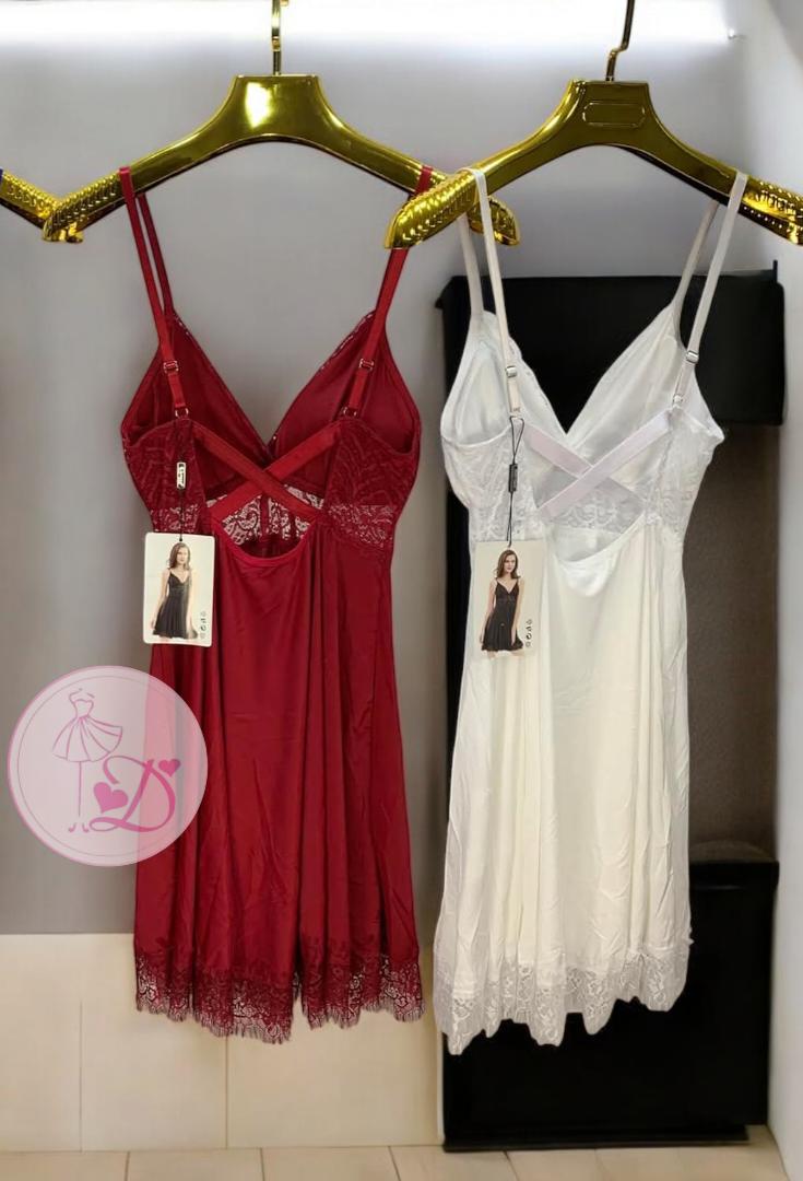 Sa coupe légèrement évasée apporte un tombé léger et féminin, parfait pour vous sentir belle et à l’aise. Le décolleté en dentelle et les bretelles ajustables ajoutent une touche raffinée, tandis que la culotte assortie complète harmonieusement l’ensemble.