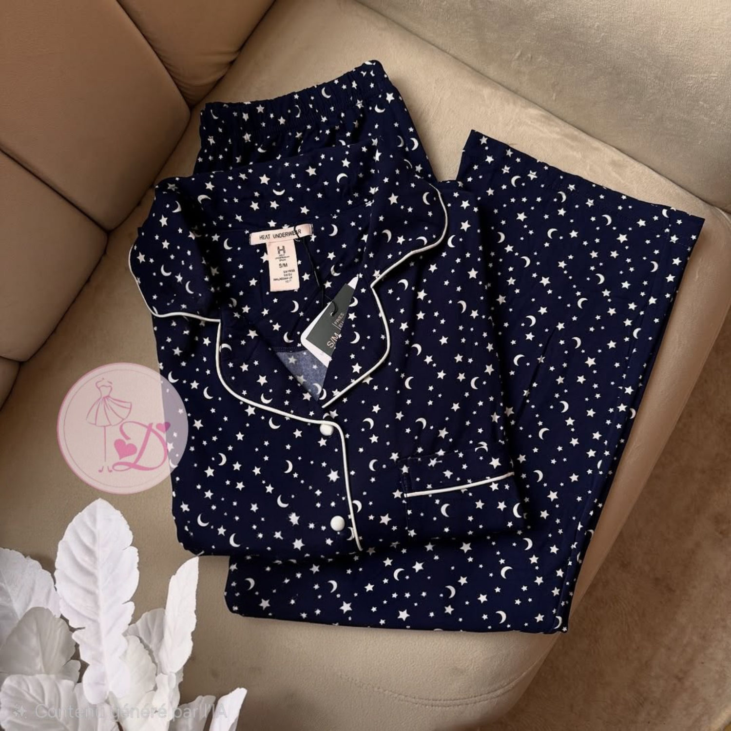 Laissez-vous séduire par ce pyjama boutonné motif étoiles, parfait pour des nuits douces et pleines de charme 💙✨