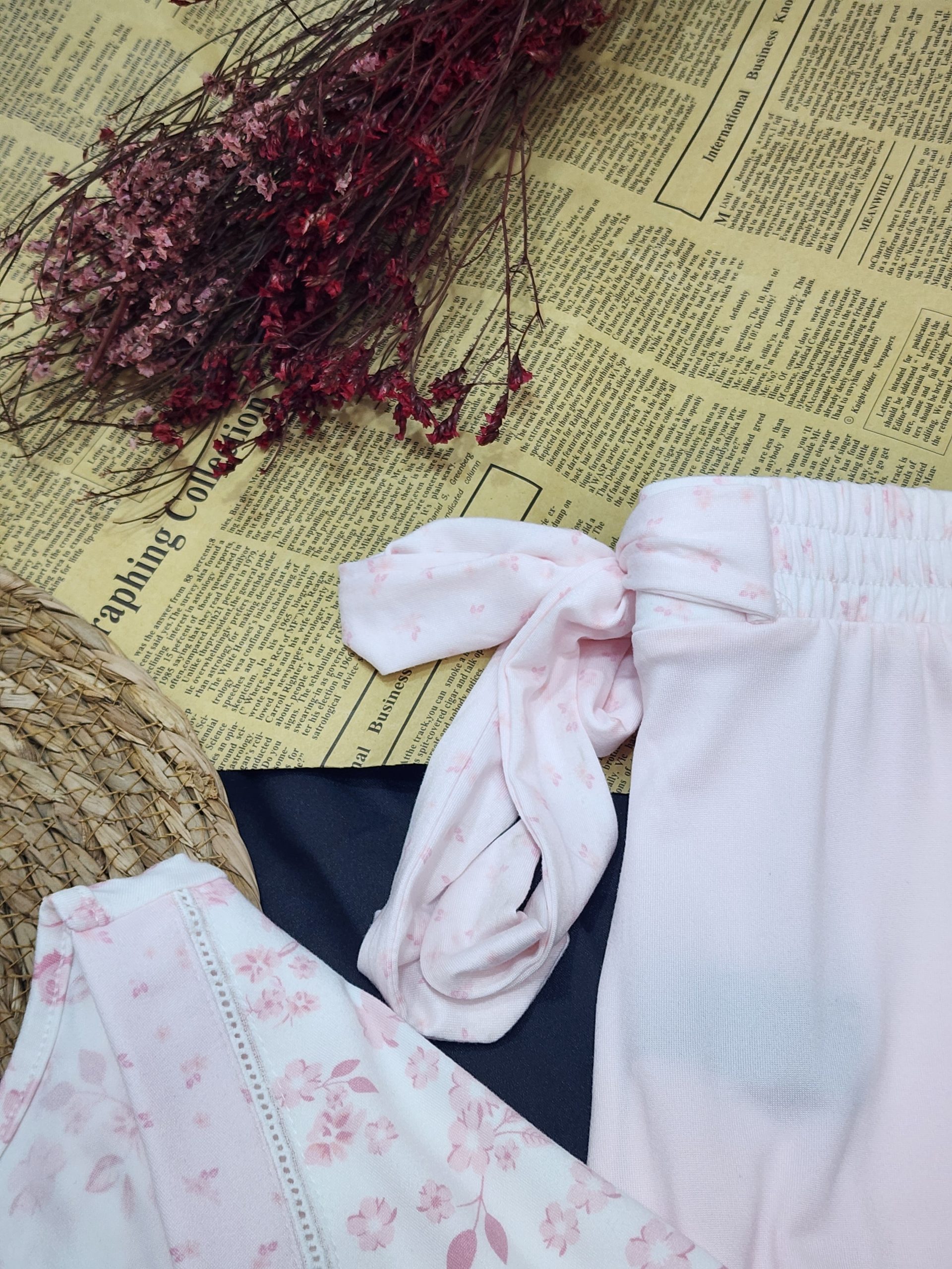 Haut à imprimé fleuri pour une touche romantique, accompagné d’un pantalon uni tout doux et léger.