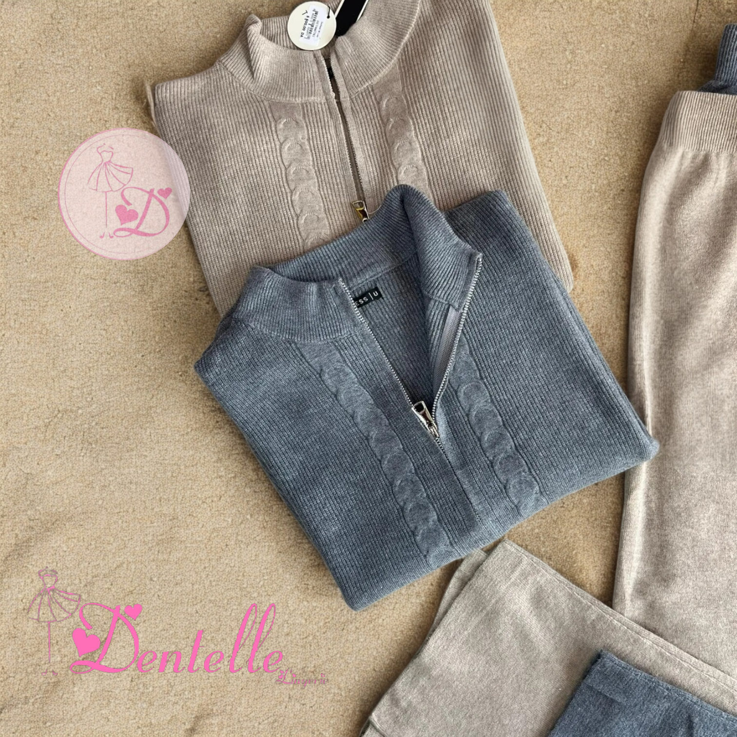 Disponible en beige et gris foncé, cet ensemble allie sobriété et élégance, parfait pour celles qui recherchent un style simple et raffiné.