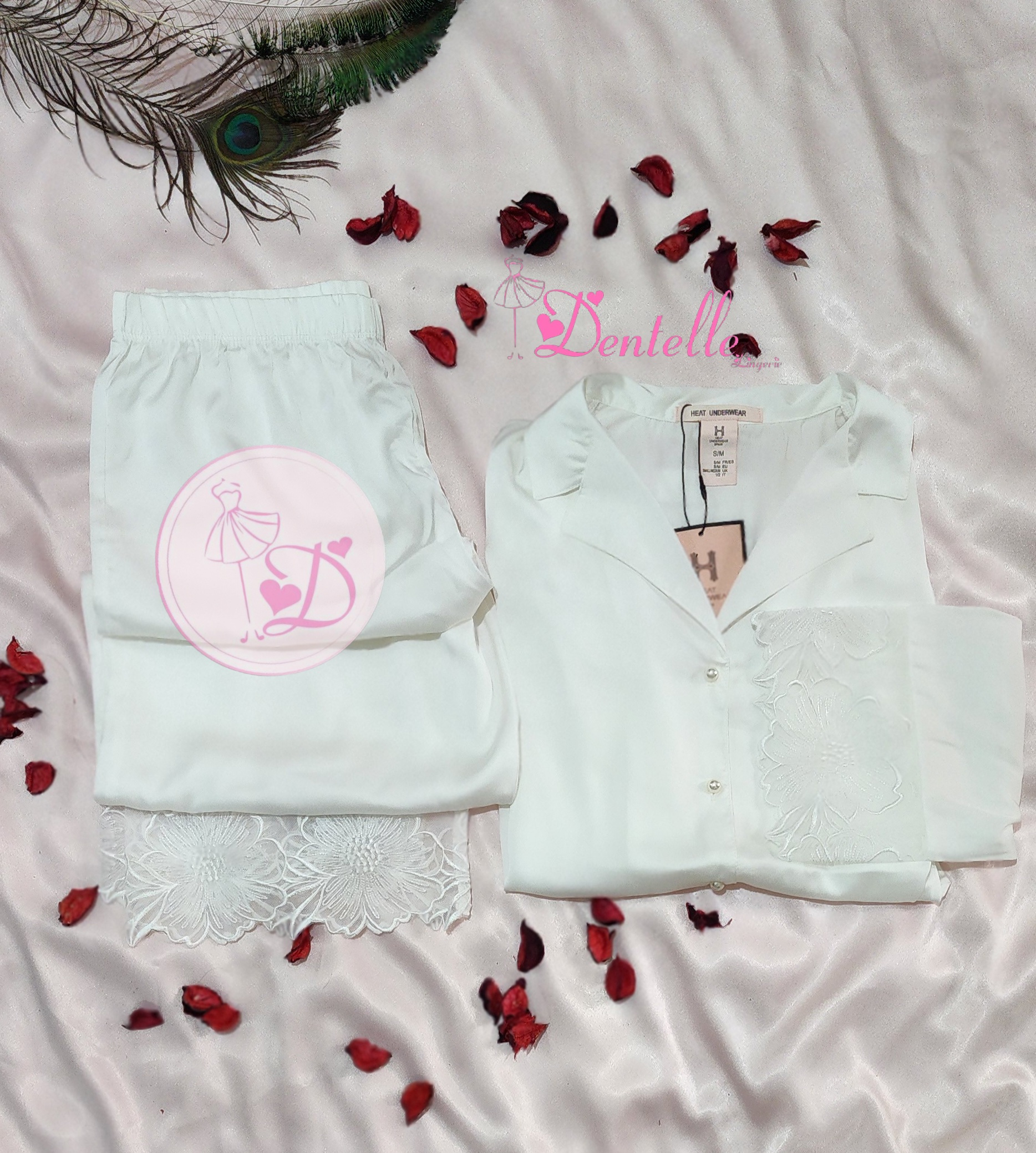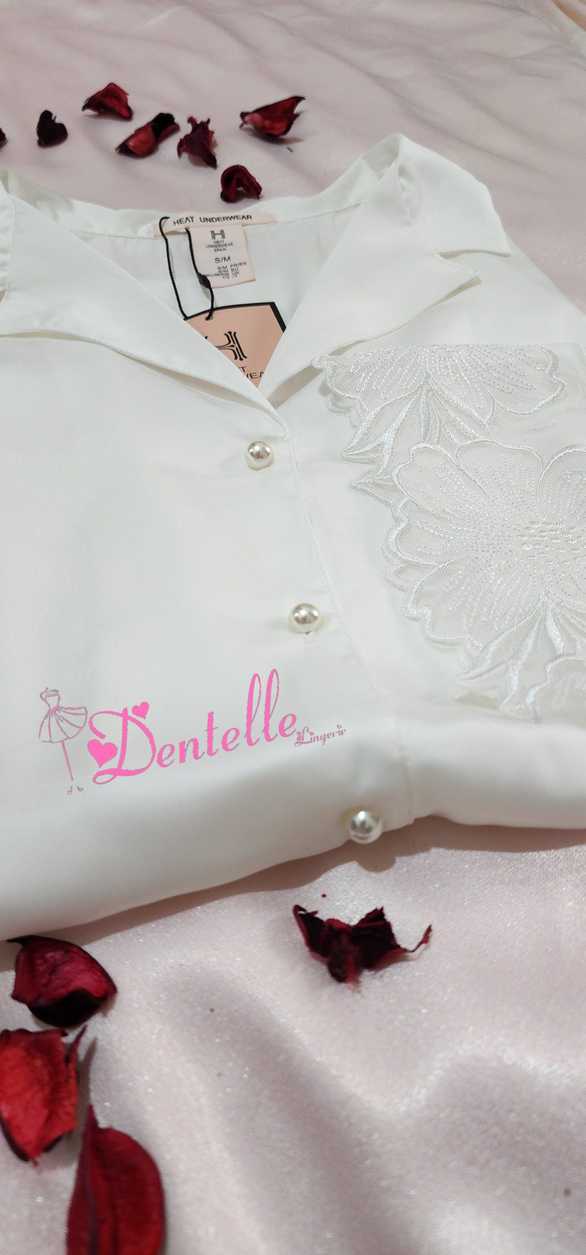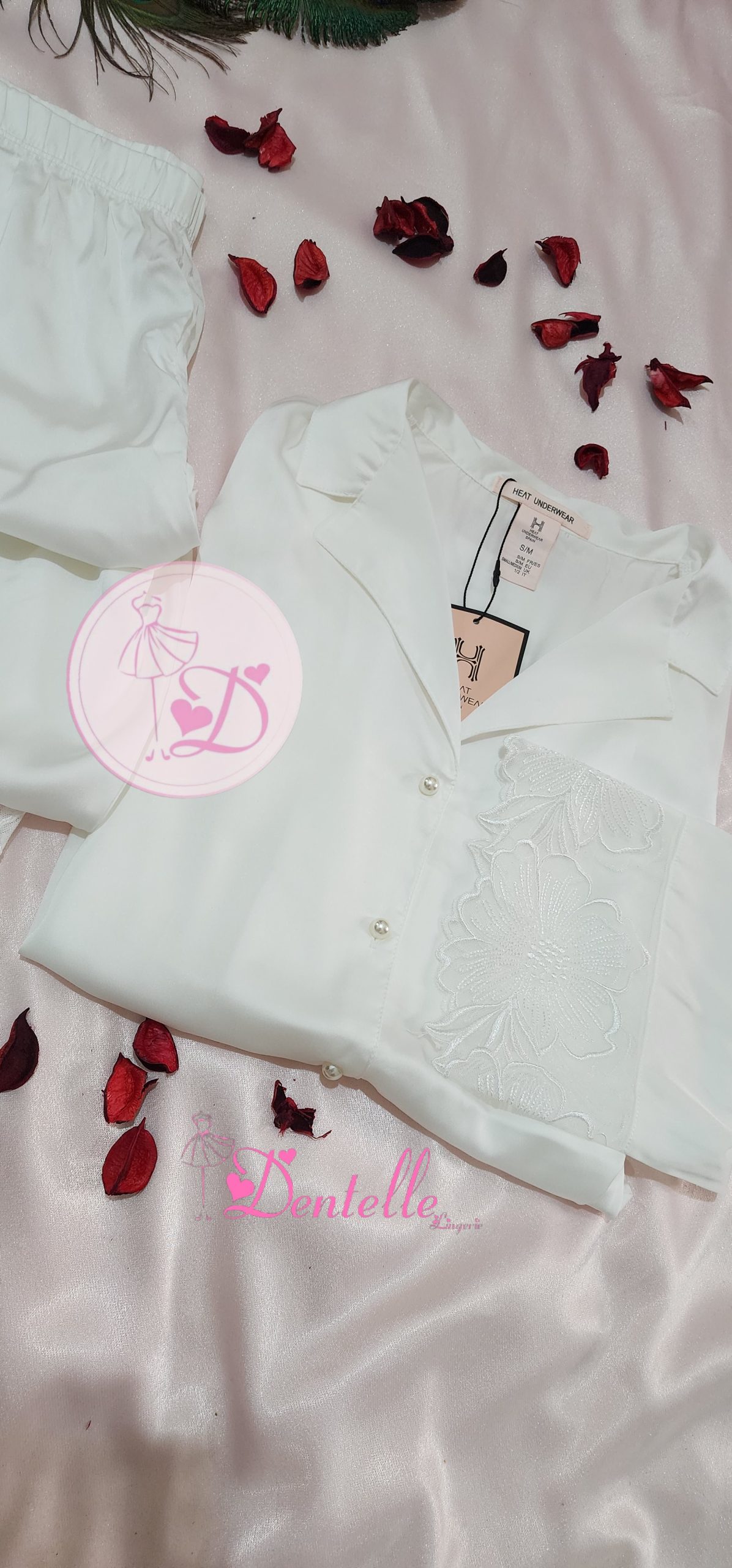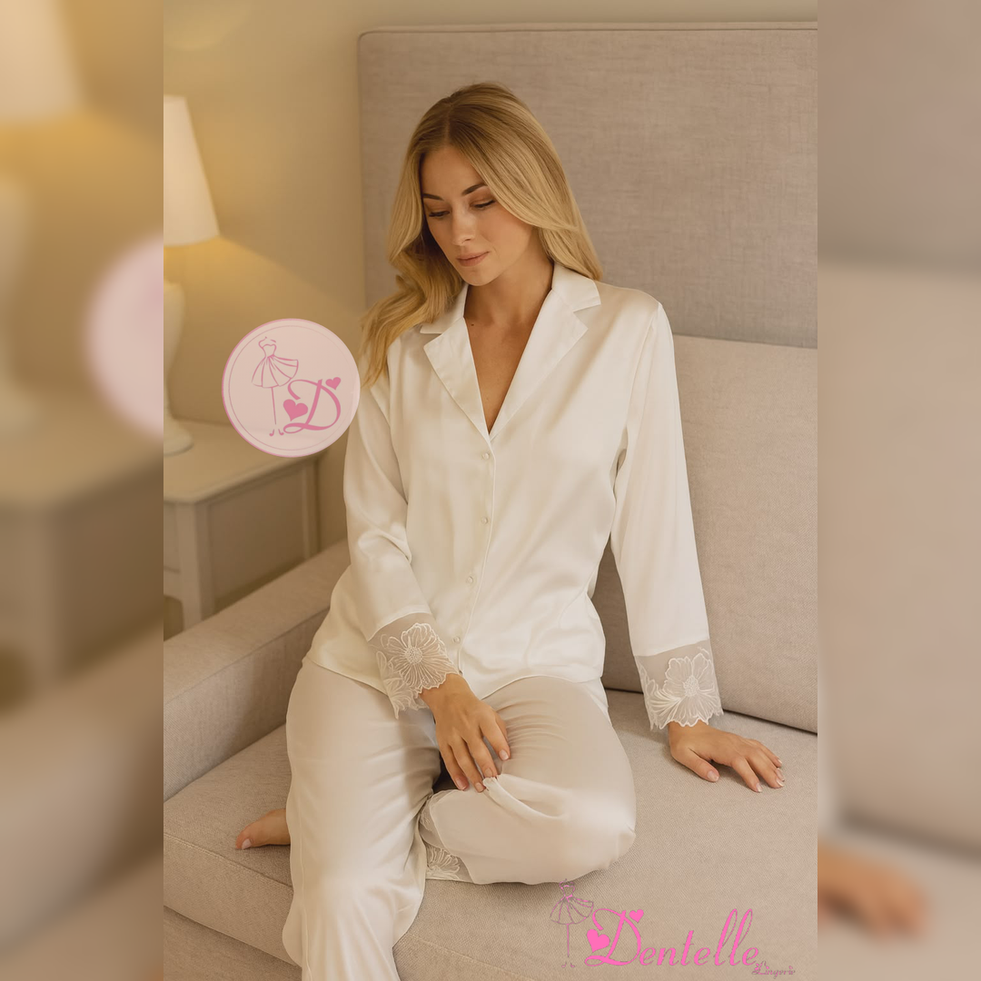 Un pyjama en satin doux et fluide, sublimé par une dentelle délicate pour un look chic et confortable. Parfait pour ajouter une touche de glamour à vos nuits.