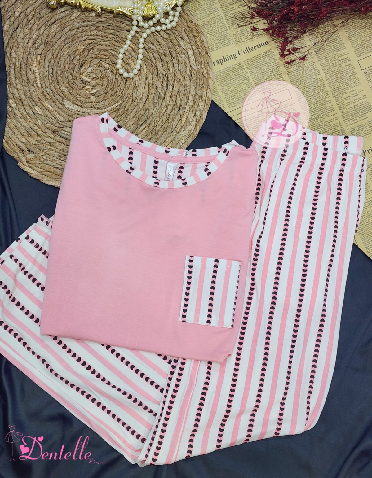 Haut uni simple et élégant, associé à un pantalon à rayures décoré de jolis petits cœurs.