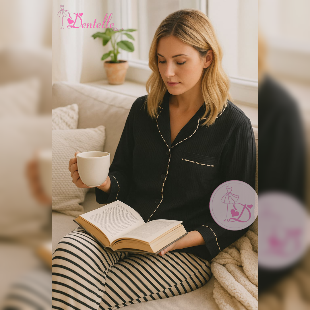 Allie élégance, confort et douceur avec ce pyjama boutonné à pantalon rayé, parfait pour les soirées cocooning ou les matinées tranquilles à la maison ☕🛌